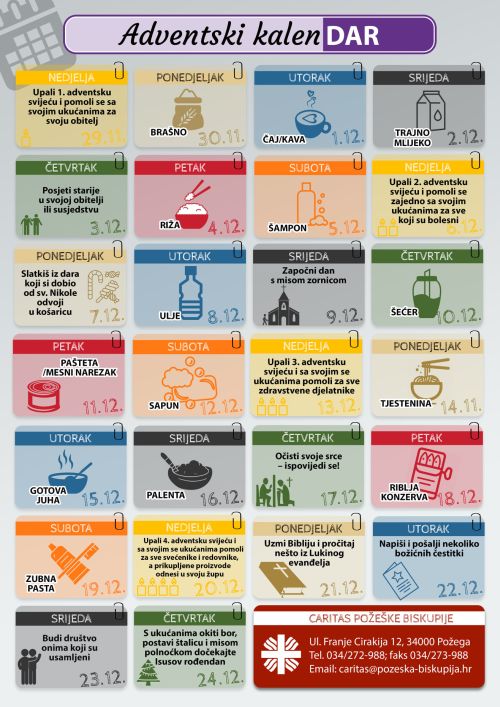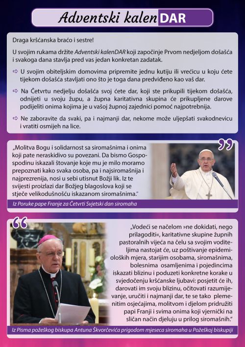 U pripravi za ovogodišnje došašće Caritas Požeške biskupije osmislio je karitativnu akciju Adventski kalenDAR. Navedena akcija sastavni je dio caritasove brige i osjetljivosti za siromašne, što se posebno želi očitovati u Mjesecu siromaha kojega je prigodom Četvrtog svjetskog dana siromaha za cijelu Požešku biskupiju proglasio požeški biskup Antun Škvorčević. Uključujući se u dinamizam raznovrsnog služenja svima kojima je pomoć potrebna spomenutom akcijom želi se potaknuti djecu i mlade, obitelji i pojedince, da svojim odricanjem i darivanjem, u skladu s vlastitim mogućnostima, pomognu onima kojima je pomoć najpotrebnija.
