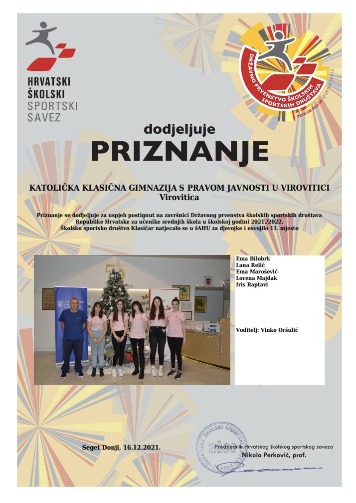 U Donjem Segetu od 16.-18.12. po prvi puta održano je Državno natjecanje učenika srednjih škola u šahu u muškoj i ženskoj konkurenciji u organizaciji Hrvatskog školskog sportskog saveza. Pravo sudjelovanja na ovom natjecanju stekli su županijski prvaci. Virovitičko podravsku županiju u konkurenciji djevojaka predstavljala je ekipa ŠSD Klasičar Katoličke klasične gimnazije s pravom javnosti u Virovitici.Na ovom natjecanju nastupilo je 17 Školskih sportskih društava u konkurenciji djevojaka. Odigrano je devet kola. Djevojke ŠSD Klasičar odigrale su dosta dobro na ovom natjecanju i na kraju zauzele 11.mjesto. Treba napomenuti da je dosta ekipa u svom sastavu imalo rangirane šahistice koje redovito nastupaju u šahovski klubovima, što nije slučaj sa našom ekipom, a time je rezultat i postignut uspjeh veći.Ekipa je nastupila u sastavu: Ema Bilobrk (1.r), Ema Marošević i Lana Relić (2.r), Lorena Majdak i Iris Raptavi (3.r).