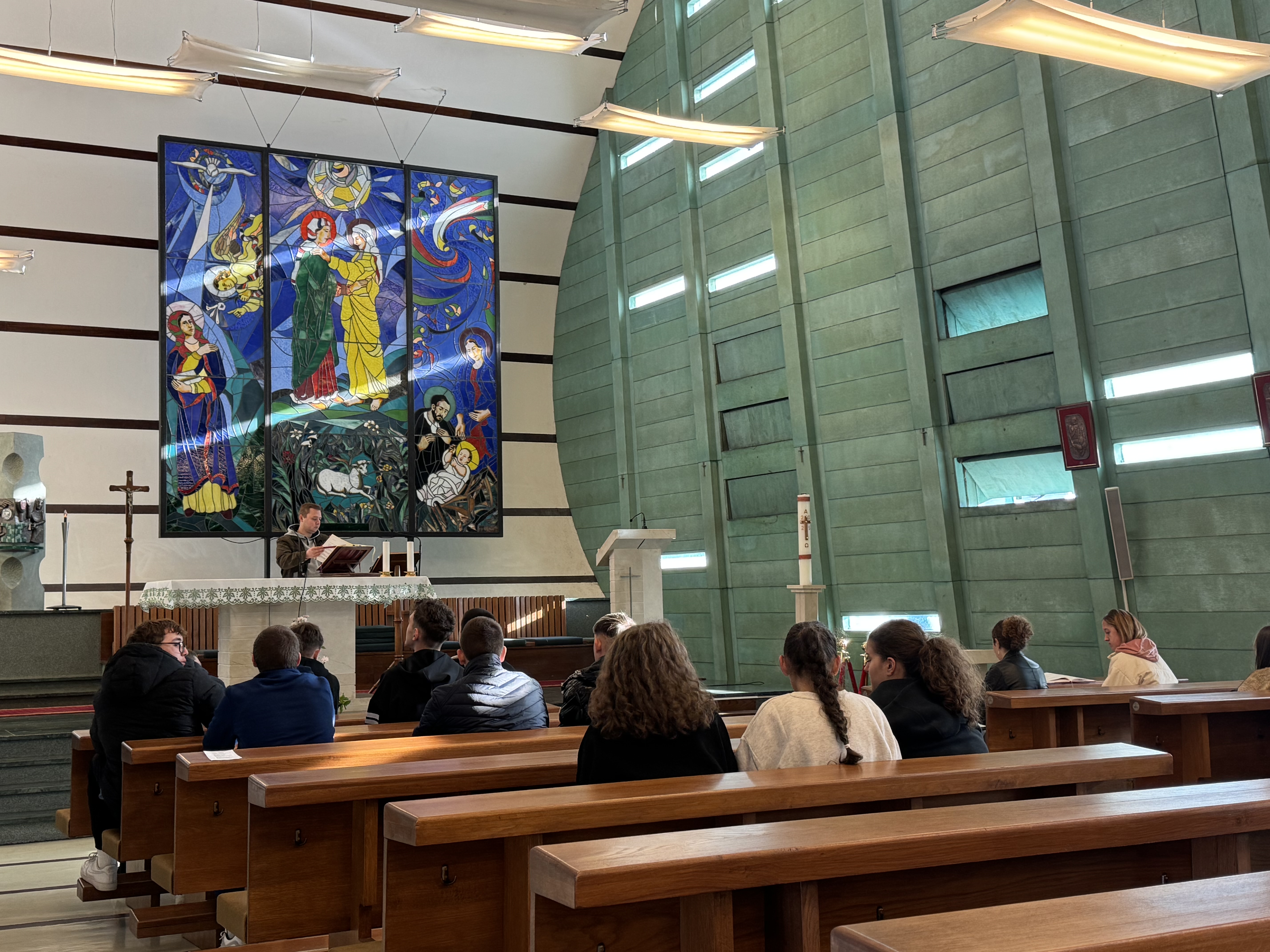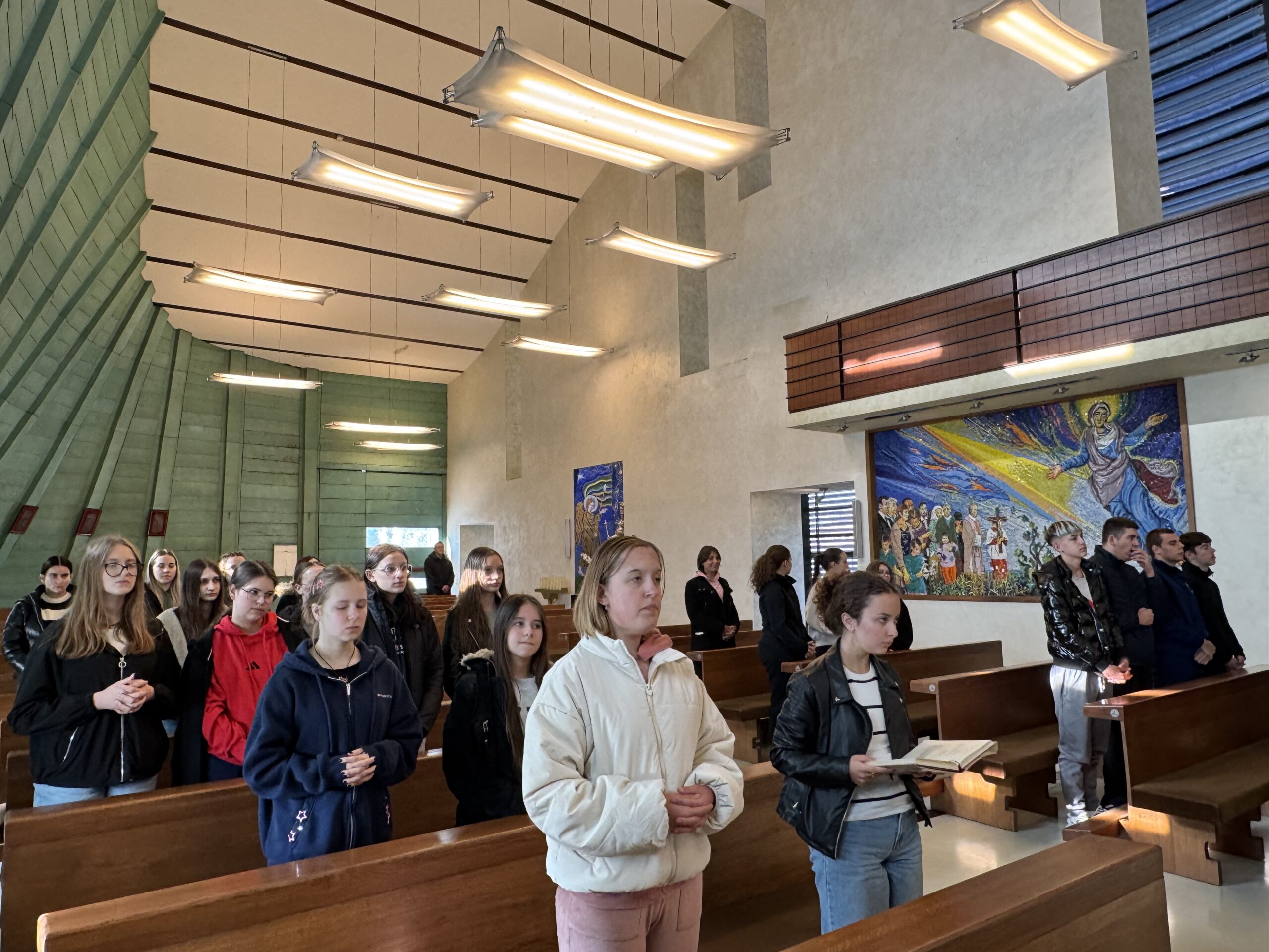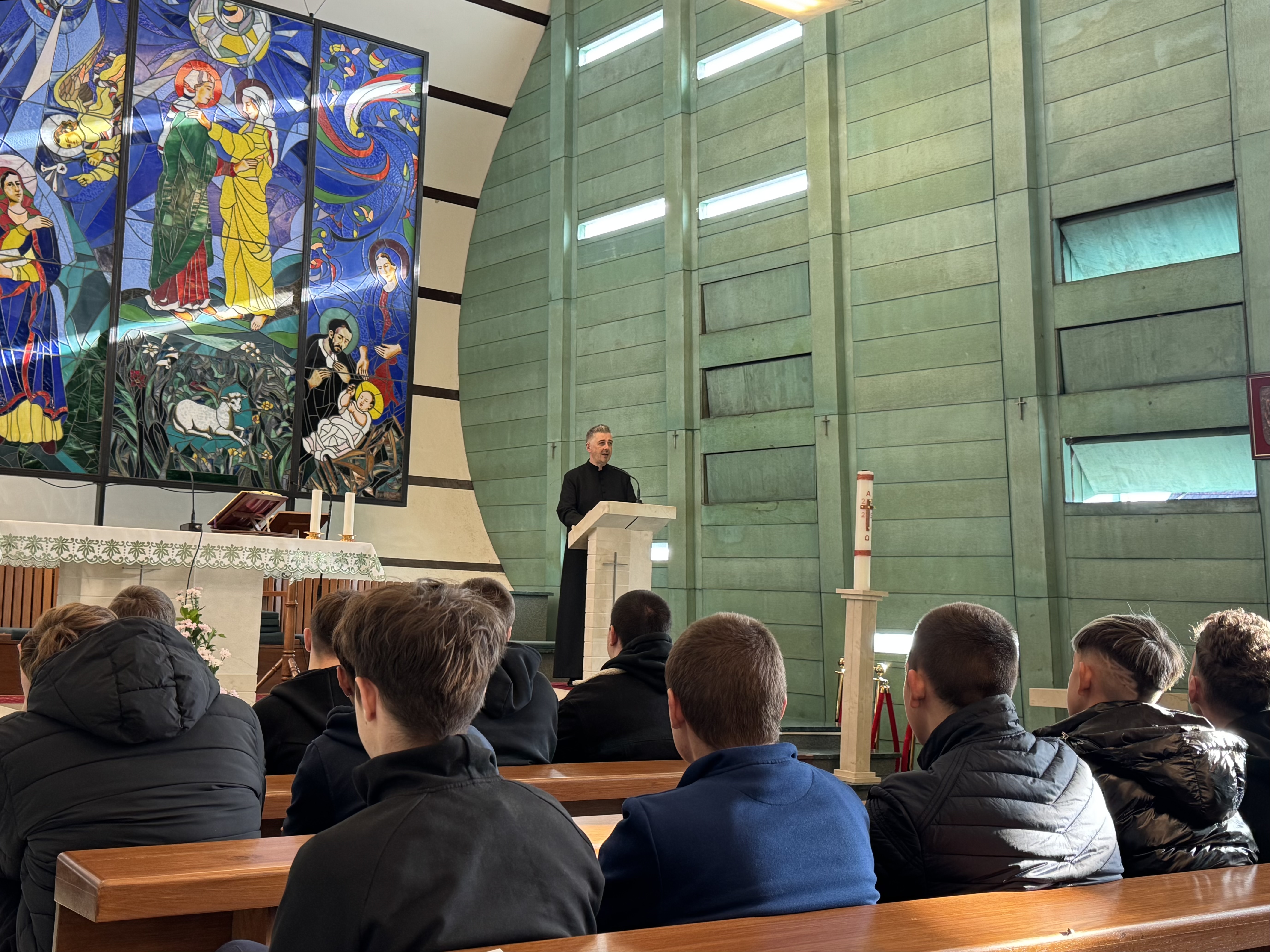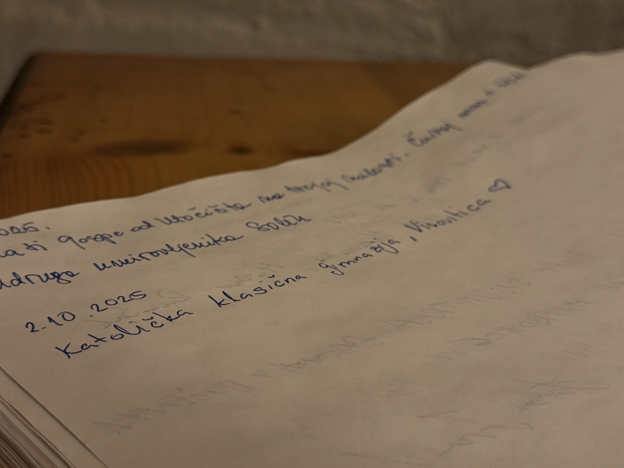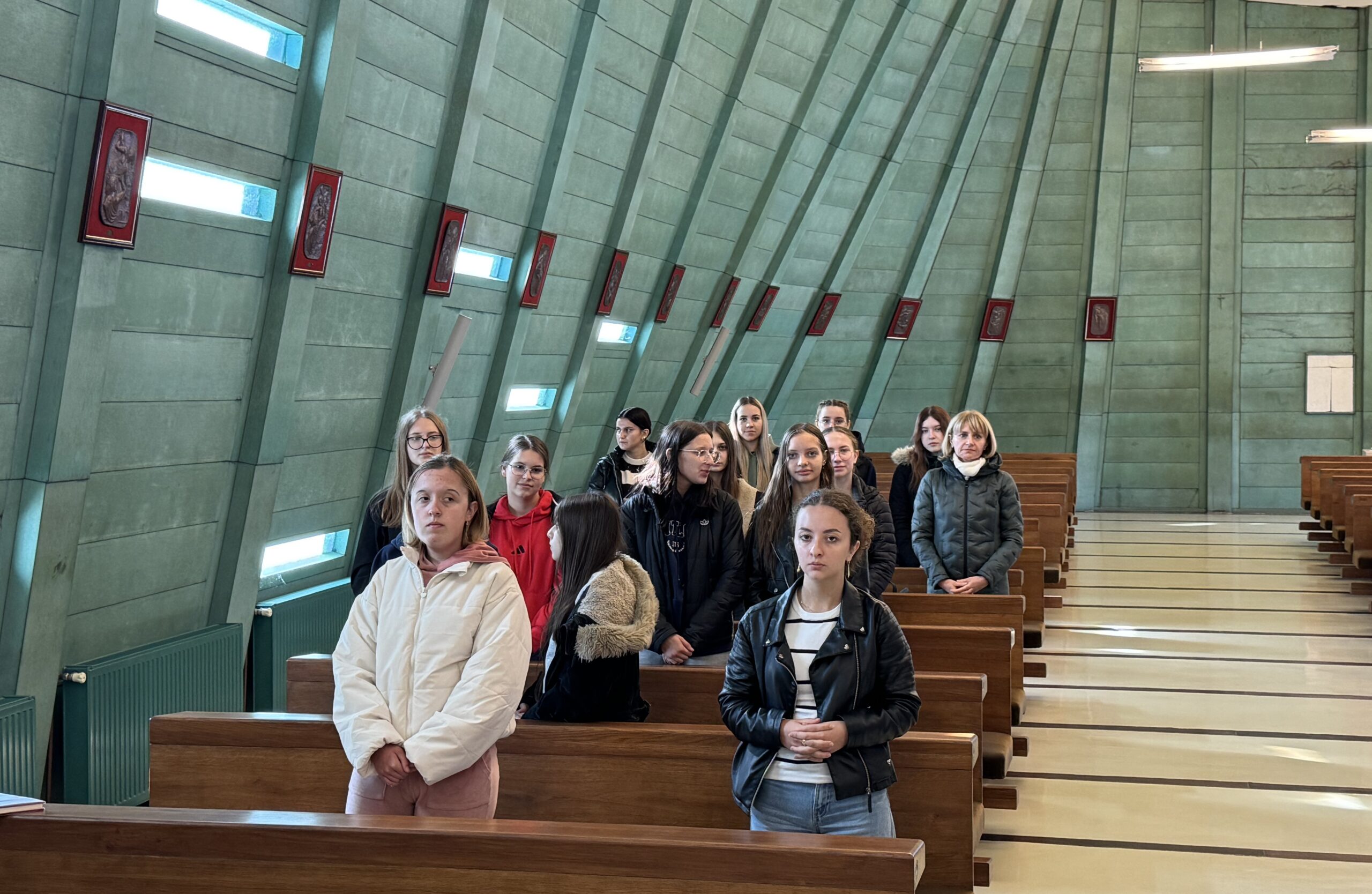U četvrtak, 2. listopada 2025., hodočastili smo u Aljmaš u povodu početka izvannastavne aktivnosti Bl. Ivan Merz, u želji stjecanja zagovora Blažene Djevice Marije i njezina vodstva na našem putu, u druženju s bl. Ivanom Merzom. Po dolasku u Aljmaš dočekao nas je tamošnji mjesni župnik i upravitelj svetišta, vlč. dr. Tomislav Ćurić, koji nam je uputio riječi dobrodošlice i predstavio svetište. U crkvi Gospe od Utočišta nazočili smo svetoj misi koju je predvodio vlč. Karlo Topalović. U propovijedi nas je vlč. Karlo sve potakao na molitvu našem anđelu čuvaru. Nakon misnog slavlja uputili smo se prema Memorijalnom centru gdje smo se uz vodstvo jednog od lokalnih stanovnika vratili u razdoblje Domovinskog rata i imali priliku upoznati se s teškom prošlošću Aljmaša. Tako smo vidjeli kip Gospe koji je spašen iz urušene crkve, dokumente o izgradnji i dovršetku aljmaškog svetišta, relikviju Svetog Križa i razne umjetnine koje su izradili akademski slikari i kipari. Kako ovo hodočašće ne bi prošlo samo u učenju, dobili smo mogućnost sudjelovanja i uživanja u zabavnijem i rekreativnijem dijelu. Posjetili smo kupalište Aquapolis koje se nalazi u sklopu Bizovačkih toplica i osvježili se u vodenim atrakcijama koje ono nudi. Kući smo se vratili prepuni dojmova i stečenog znanja, pomalo umorni, ali i duhovno osnaženi i zahvalni na tako lijepo provedenom danu.