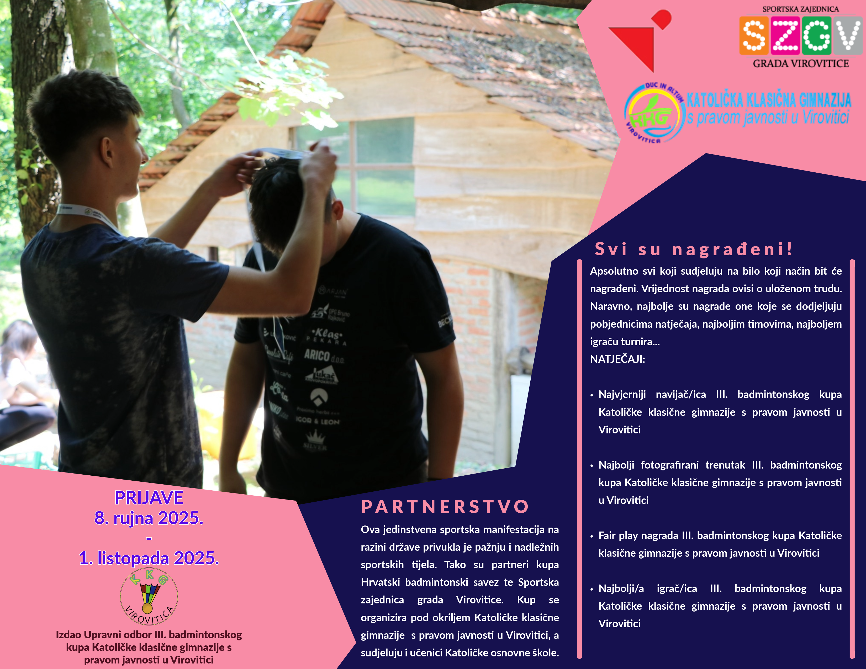 Bliži se početak 3. izdanja jedne od najvećih sportskih manifestacija naše škole – badmintonskog kupa Katoličke klasične gimnazije s pravom javnosti u Virovitici. Natjecanje organizira učenik Mihael Šuprna, a vode ga isključivo učenici i djelatnici naše škole. Partneri kupa su Hrvatski badmintonski savez i Sportska zajednica grada Virovitice, a sudjelovati mogu svi učenici naše škole te učenici 7. i 8. razreda Katoličke osnovne škole u Virovitici.