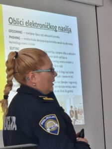 Učenici su imali priliku čuti što je to nasilje na internetu, koji su oblici elektroničkog nasilja te kako obična fotografija koju objavimo na društvenim mrežama može biti zloupotrebljiva. Nakon predavanja na ovu temu učenici su upoznati s mogućnošću školovanja za zanimanje policajac/policajka.