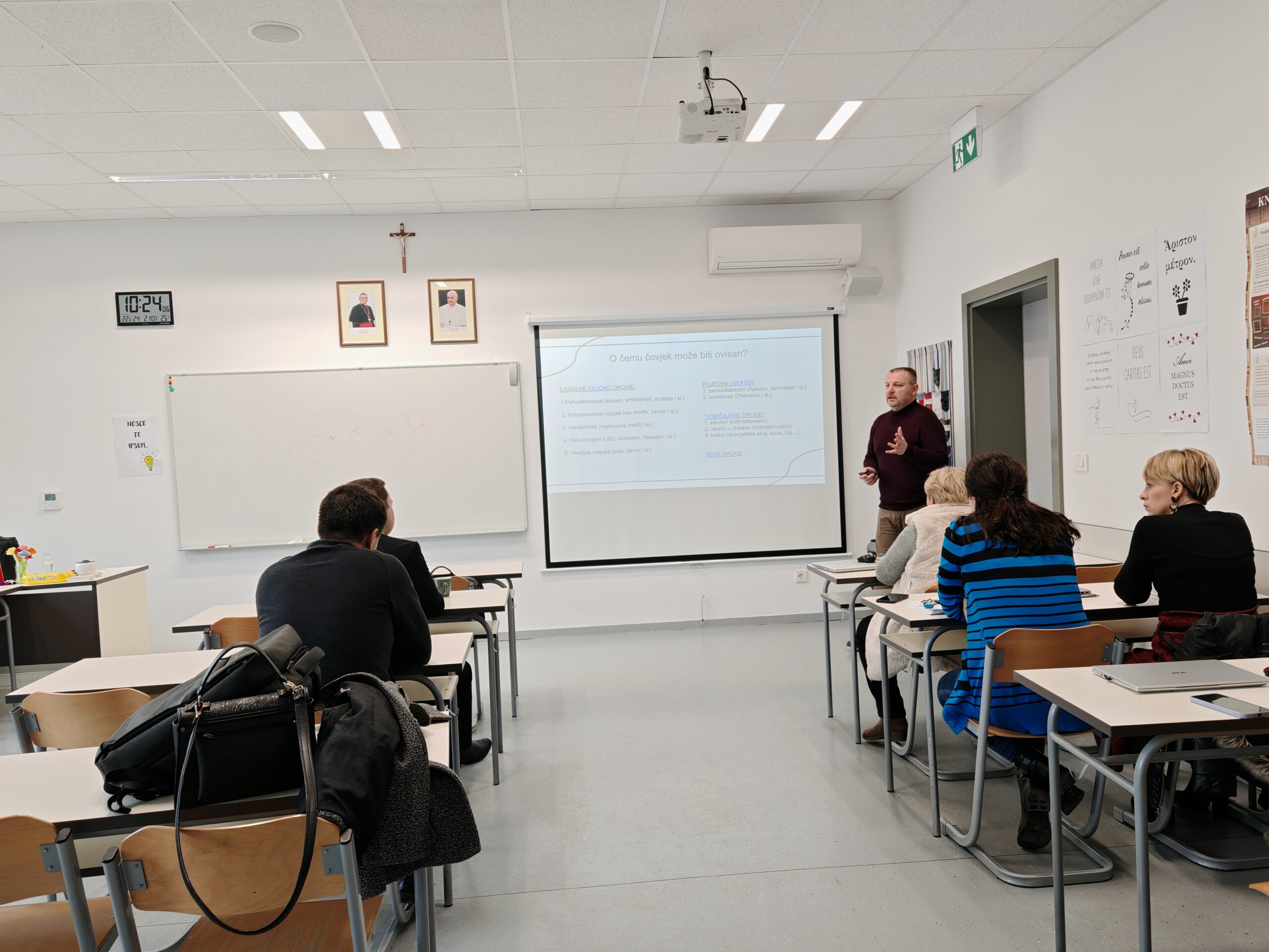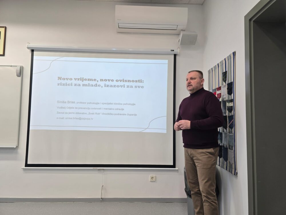 Drugo predavanje održao je Siniša Brlas, profesor psihologije i voditelj Odjela za prevenciju ovisnosti i mentalno zdravlje Zavoda za javno zdravstvo “Sveti Rok”. Profesor Brlas upoznao je sudionike s modernim oblicima ovisnosti i opasnostima koje iz njih proizlaze, s ciljem lakšeg prepoznavanja znakova potencijalno zabrinjavajućeg ponašanja mladih te pravovremenog reagiranja i prevencije opasnih posljedica.