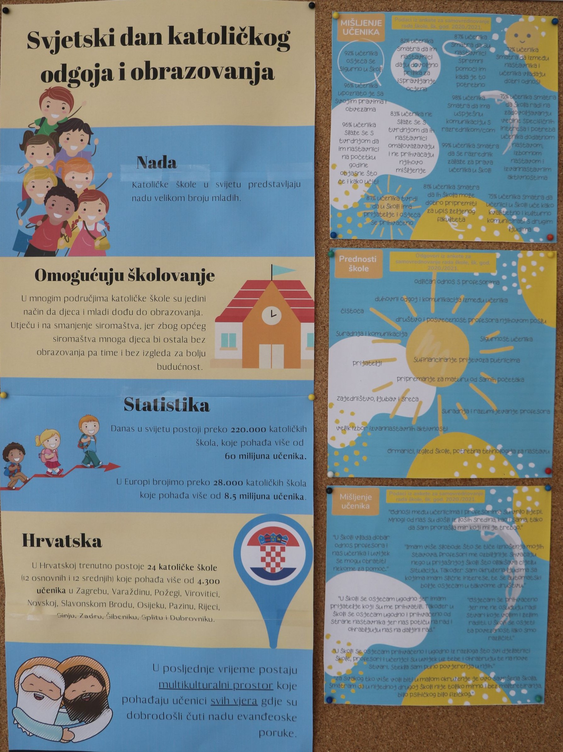 O katoličkom odgoju promišljali su gimnazijalci koji su ispunili anketu o dojmovima sa svojom školom, ali i osnovnoškolci u produženom boravku te na satima Vjeronauka koji su se, promišljajući o svojoj školi i katoličkom odgoju, kreativno izražavali. Iz učeničkih aktivnosti nastao je pano koji je sadrži opće podatke o katoličkim školama i Hrvatskoj i svijetu, kreativne radove osnovnoškolaca te promišljanja gimnazijalaca.