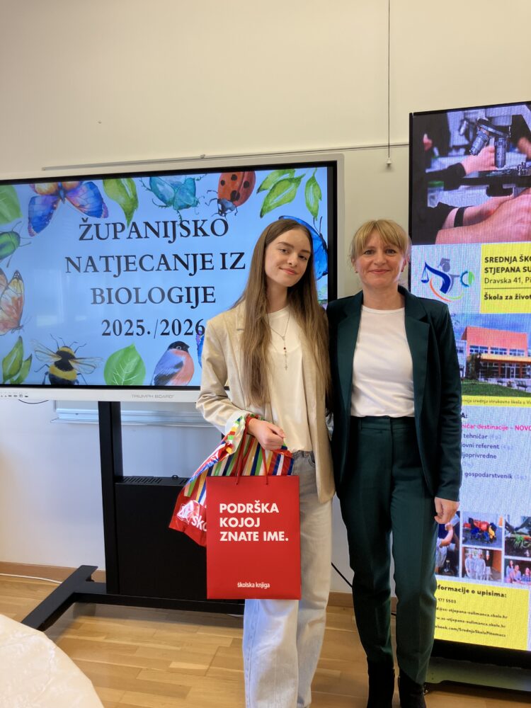 Na županijskom natjecanju iz Biologije, koje je održano 26. veljače 2026. u Srednjoj školi Stjepana Sulimanca u Pitomači, sudjelovala je naša učenica Ema Dumić. U kategoriji učenika trećih razreda Ema je osvojila 1. mjesto. Čestitamo na izvrsnom plasmanu! Mentorica je profesorica Andrea Bobanac.