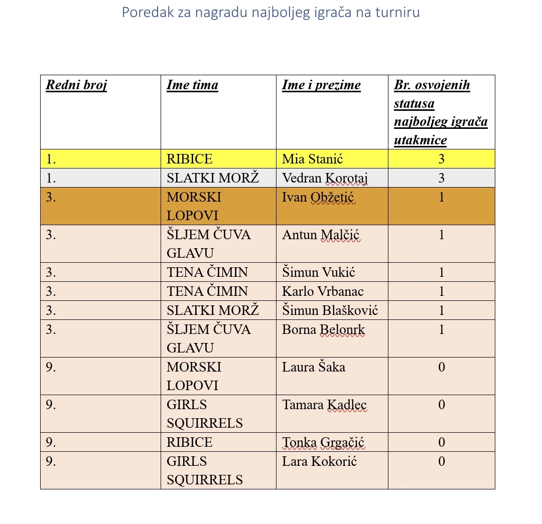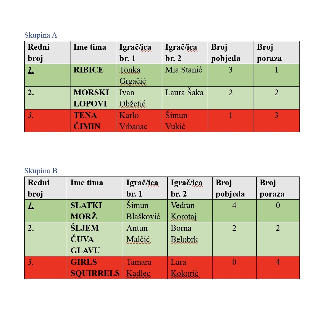 Trećeplasirani timovi ostali su bez plasmana u polufinale. Ždrijebom koji je bio dogovoren prije početka samoga turnira, timovi koji su prošli u sljedeću fazu natjecanja, raspoređeni su u polufinala. Tako će 1. polufinale odigrati RIBICE i ŠLJEM ČUVA GLAVU 10.04.2024., a 17.04.2024. odigrat će se i 2. polufinale u kojemu će se za prolazak u finale boriti SLATKI MORŽ i MORSKI LOPOVI. Finale i borba za 3. mjesto su po rasporedu zakazani za 19.04.2024. Ovim se putem zahvaljujemo na sudjelovanju u kupu Tamari, Lari, Karlu i Šimunu. Pružili su nam zanimljive utakmice, međutim to im nije bilo dovoljno za prolazak skupine. Također pohvaljujemo Miu, Tonku, Ivana, Lauru, Vedrana, Antuna, Bornu i Šimuna na prolasku u “knock out” fazu natjecanja. Oni će se u sljedećim utakmicama boriti za naslov prvaka te za vrijednu nagradu.